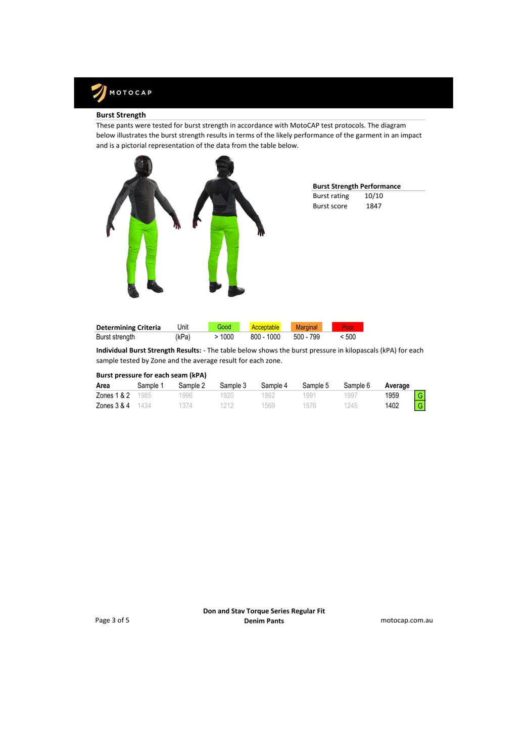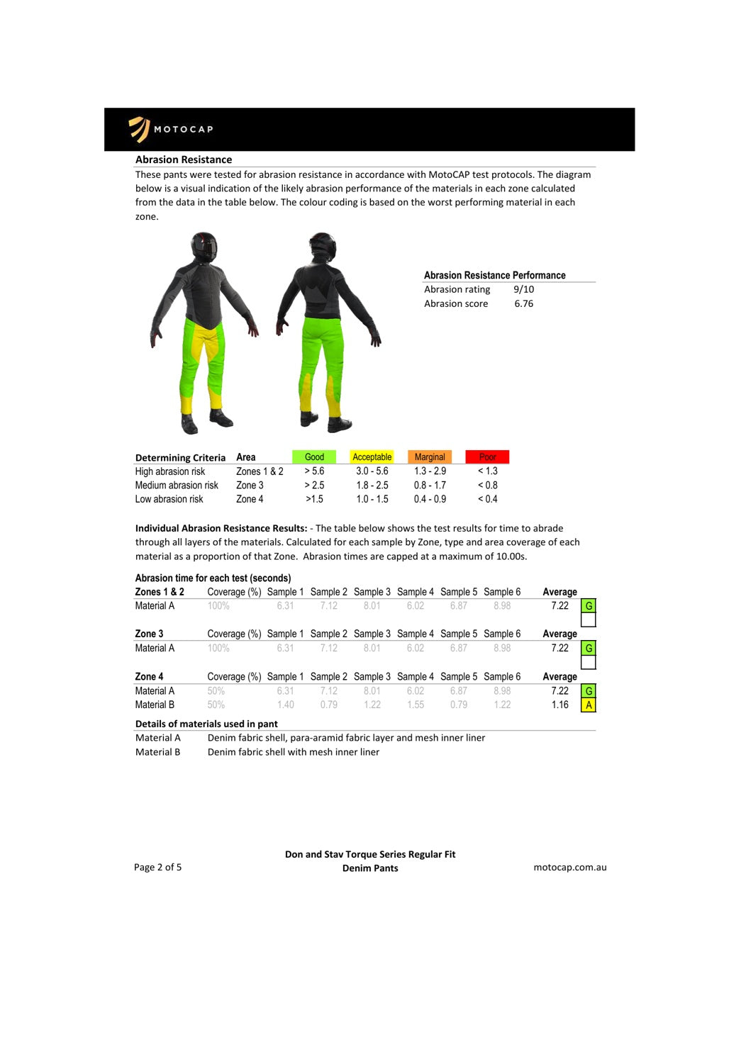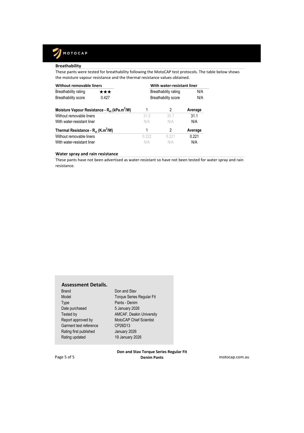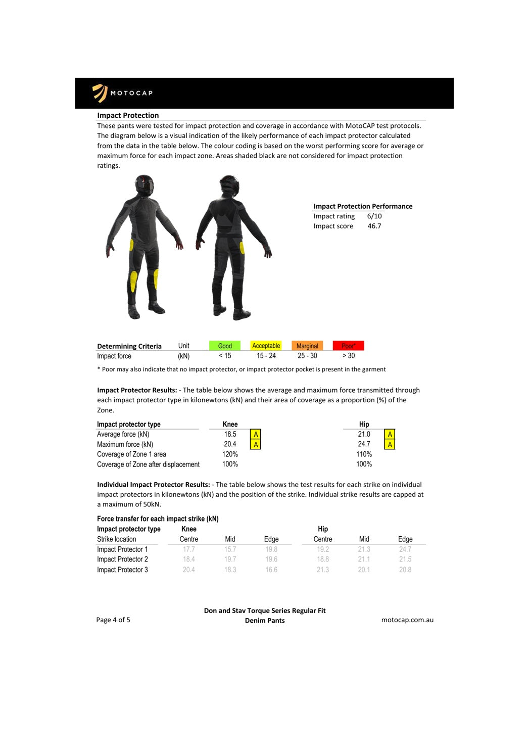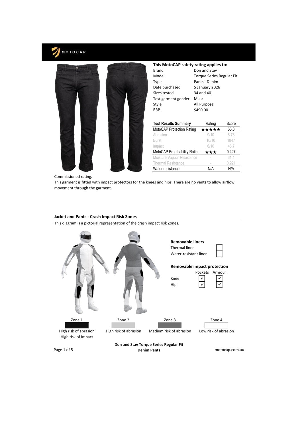 These jeans come with the highest MotoCAP protection rating, 5 stars, and a very comfortable 3 stars for breathability. You can find the official MotoCAP technical report further down this page.
